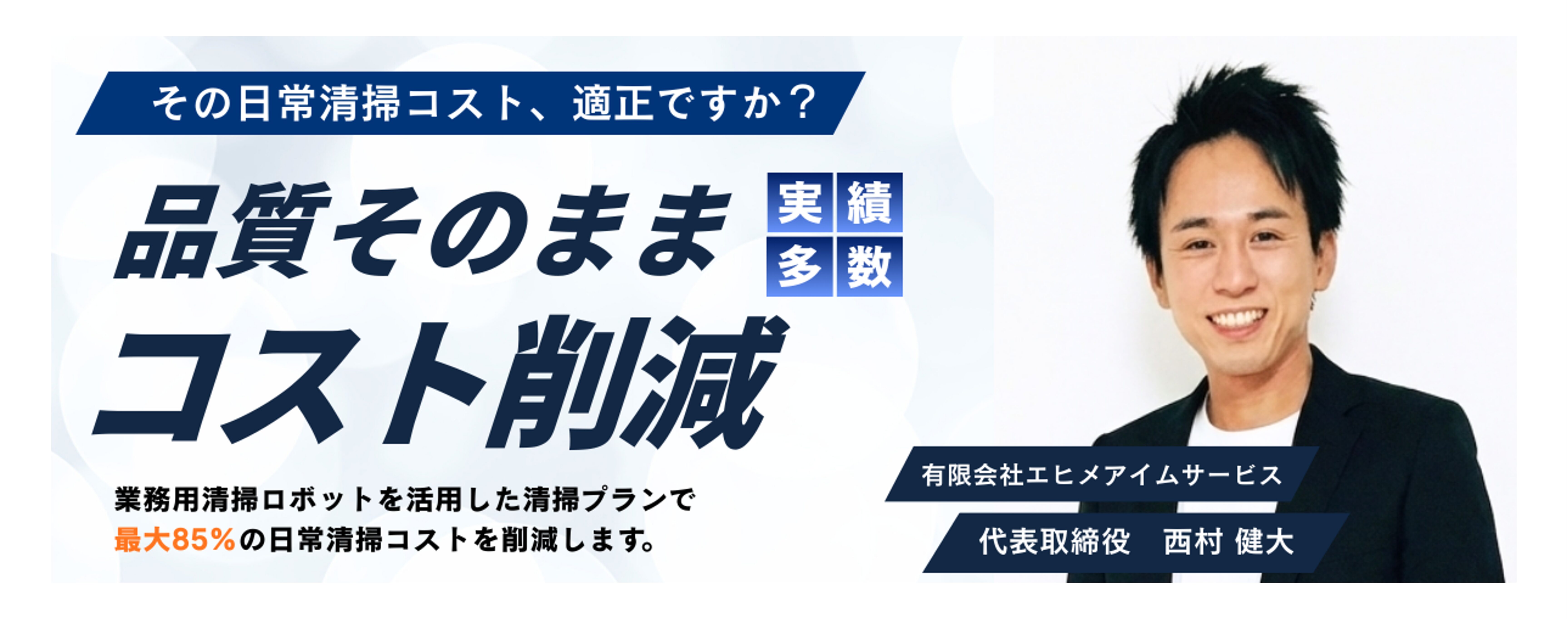 四国中央市全域でビルメンテナンス業を行うエヒメアイムサービスは、清掃ロボットの導入や清掃シフトの改善により、低価格と高品質を両立します。 ロボットが得意な床清掃は効率化。トイレやガラスなど『人の目』が必要な箇所はスタッフがしっかり磨き上げることで、オフィス、病院、店舗からマンションまでお客様の美観維持をトータルでサポートいたします。